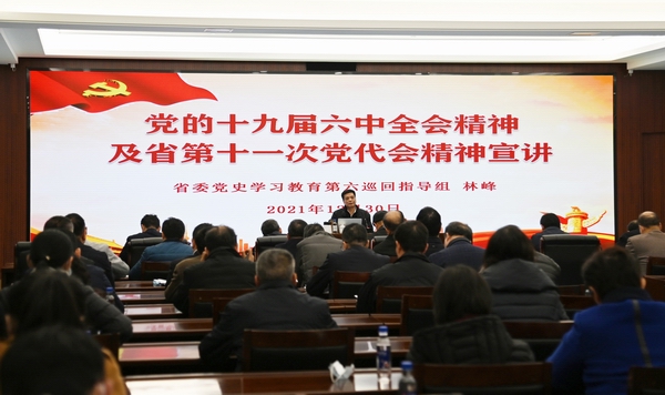 12月30日下午,党史学习教育省委第六巡回指导组副组长林峰到全球赌博十大网站开展党的十九届六中全会和省第十一次党代会精神专题宣讲。受厅党组书记、厅长刘琳委托,厅党组成员、副厅长、一级巡视员、直属机关党委书记丘汀萌主持宣讲会。